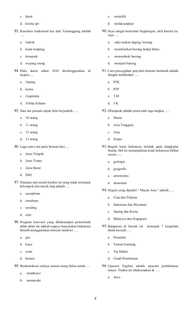 Dalam soal yang akan saya bagikan ini sudah mencangkum materi bahasa indonesia, ipa, matematika, pengetahuan sosial, dan pengetahuan lainnya. Soal yang kami berikan juga akan memberikan pembahasaan dan juga kunci jawabannya sehingga anda tidak perlu kawatir tentang soal lcc sd yang kami sampaikan tersebut. Aug 15, 2016 · download soal soal lomba cerdas cermat/ lcc tingkat sd 2016. Nov 09, 2017 · download ujian semester 1 mata pelajaran pjok kelas 6 tahun pelajarn 2019/2020 kurikulum 2013. Dibawah ini adalah soal soal untuk kegiatan lomba cerdas cermat tingkat sekolah dasar.